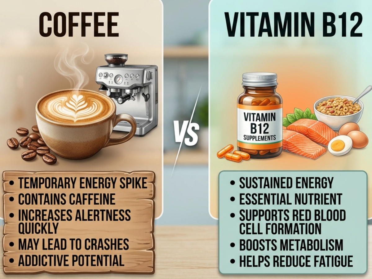 While coffee provides instant energy and depletes quickly, vitamin B12 offers a natural and safe way to provide energy and maintain your body’s overall health.